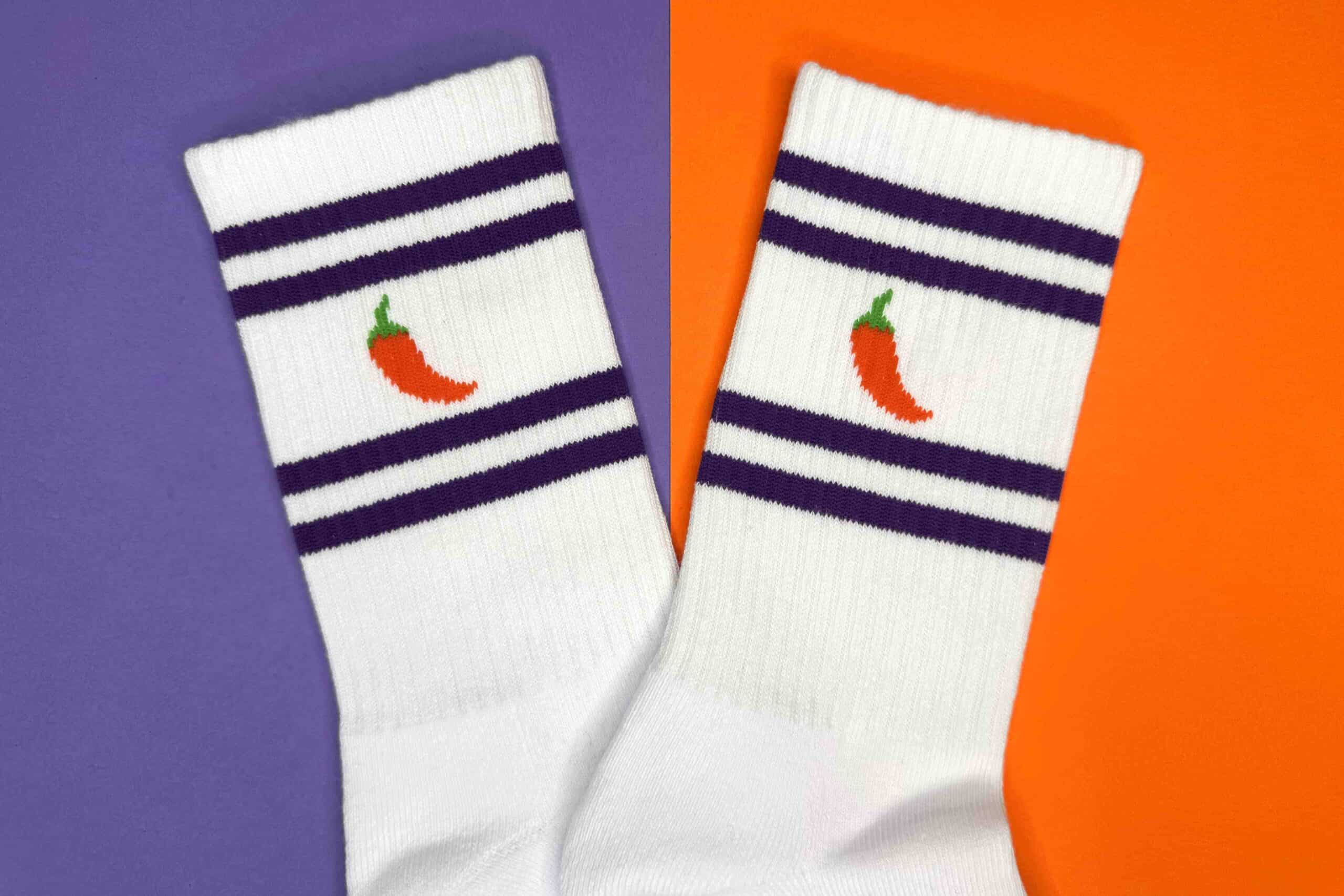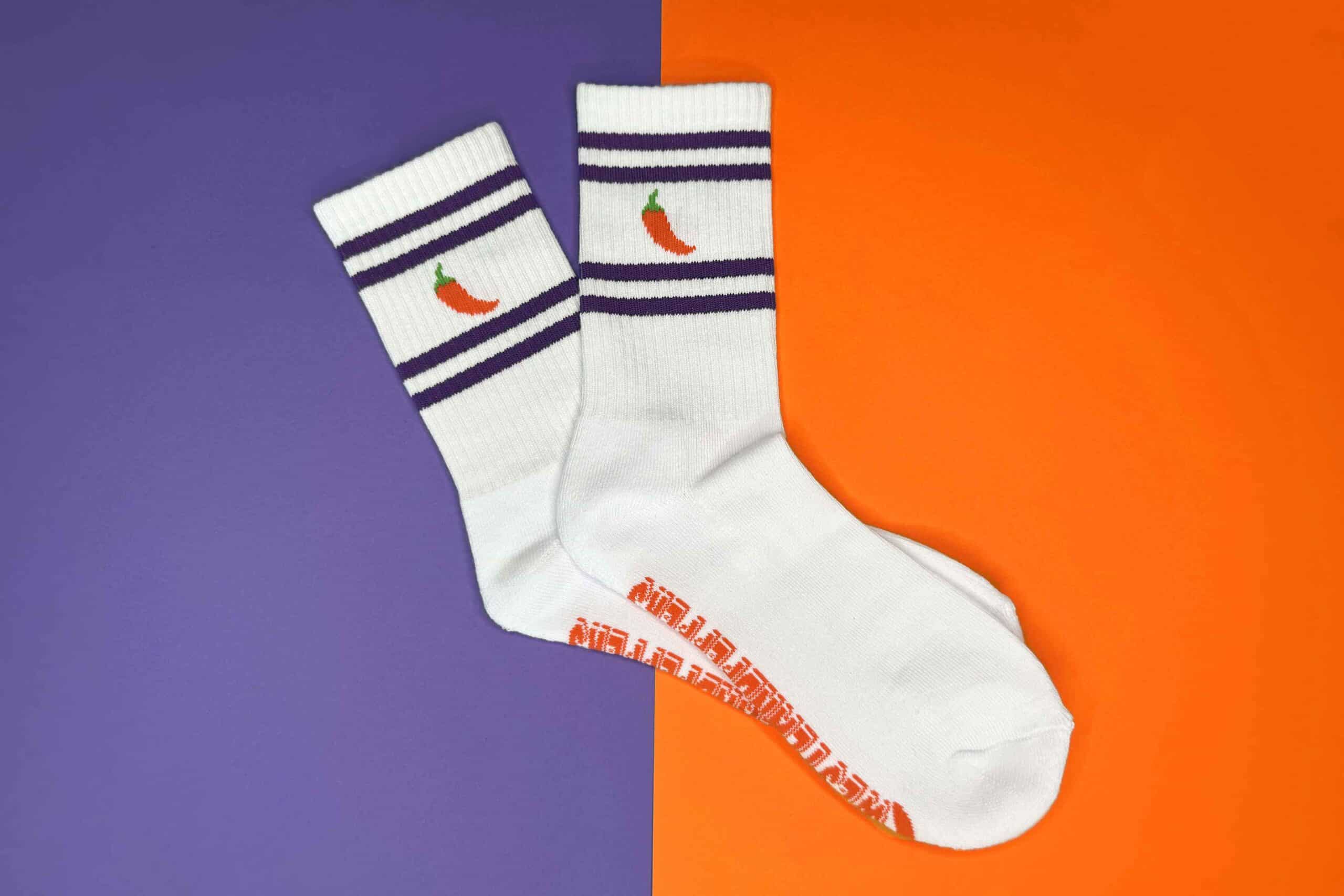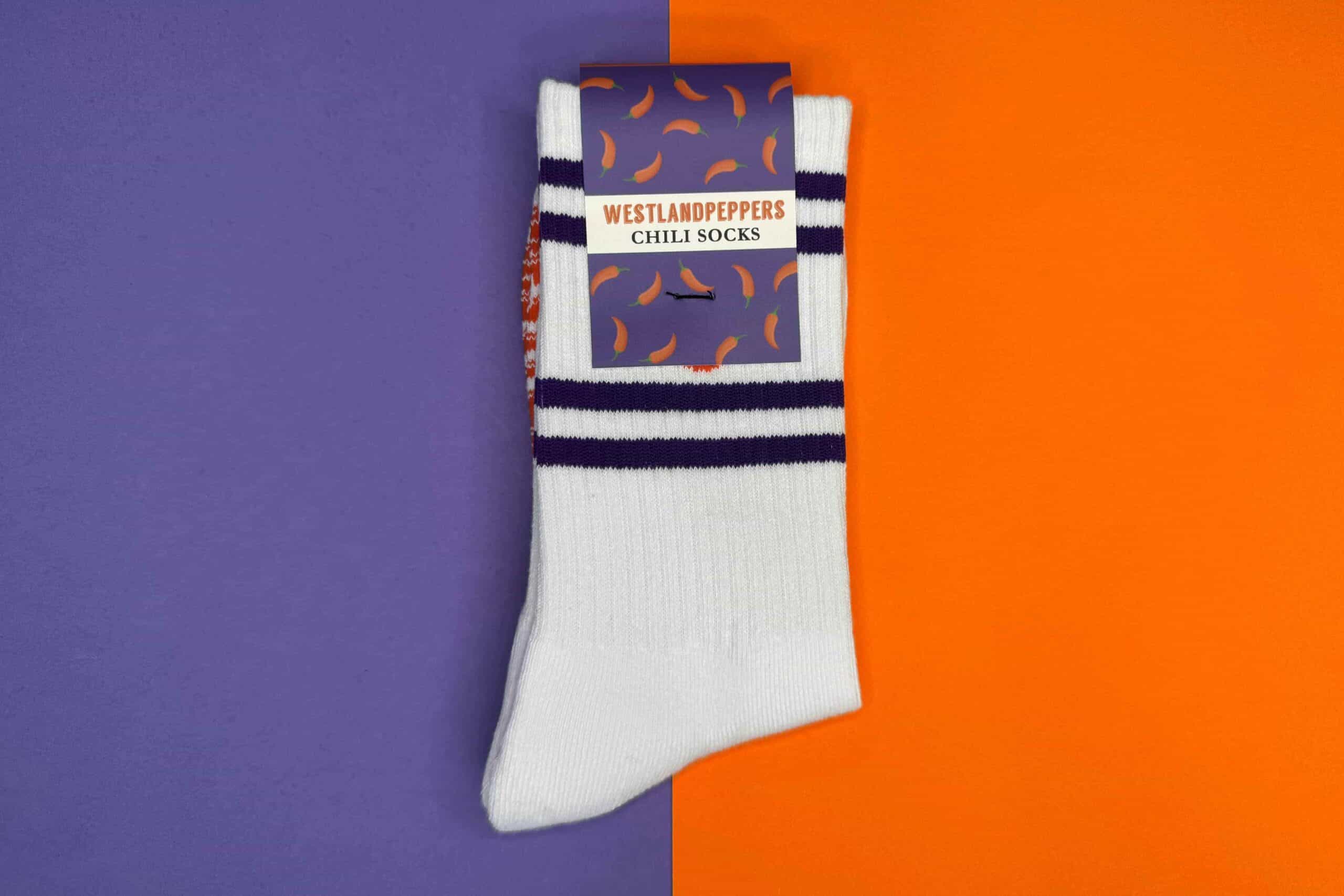 Update je garderobe met deze chilipeper sokken van Westlandpeppers. De (sport)sokken hebben een ribbelstructuur en zijn wit van kleur met paarse strepen, met daar tussen een oranje peper. De sokken zijn comfortabel met een opvallend pittig design, gemaakt van hoogwaardig katoen.